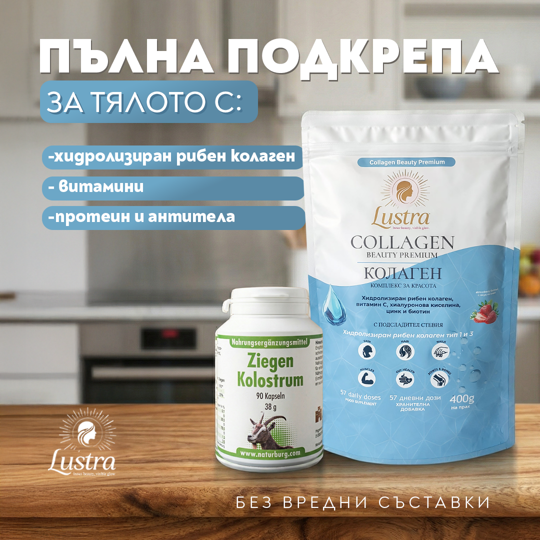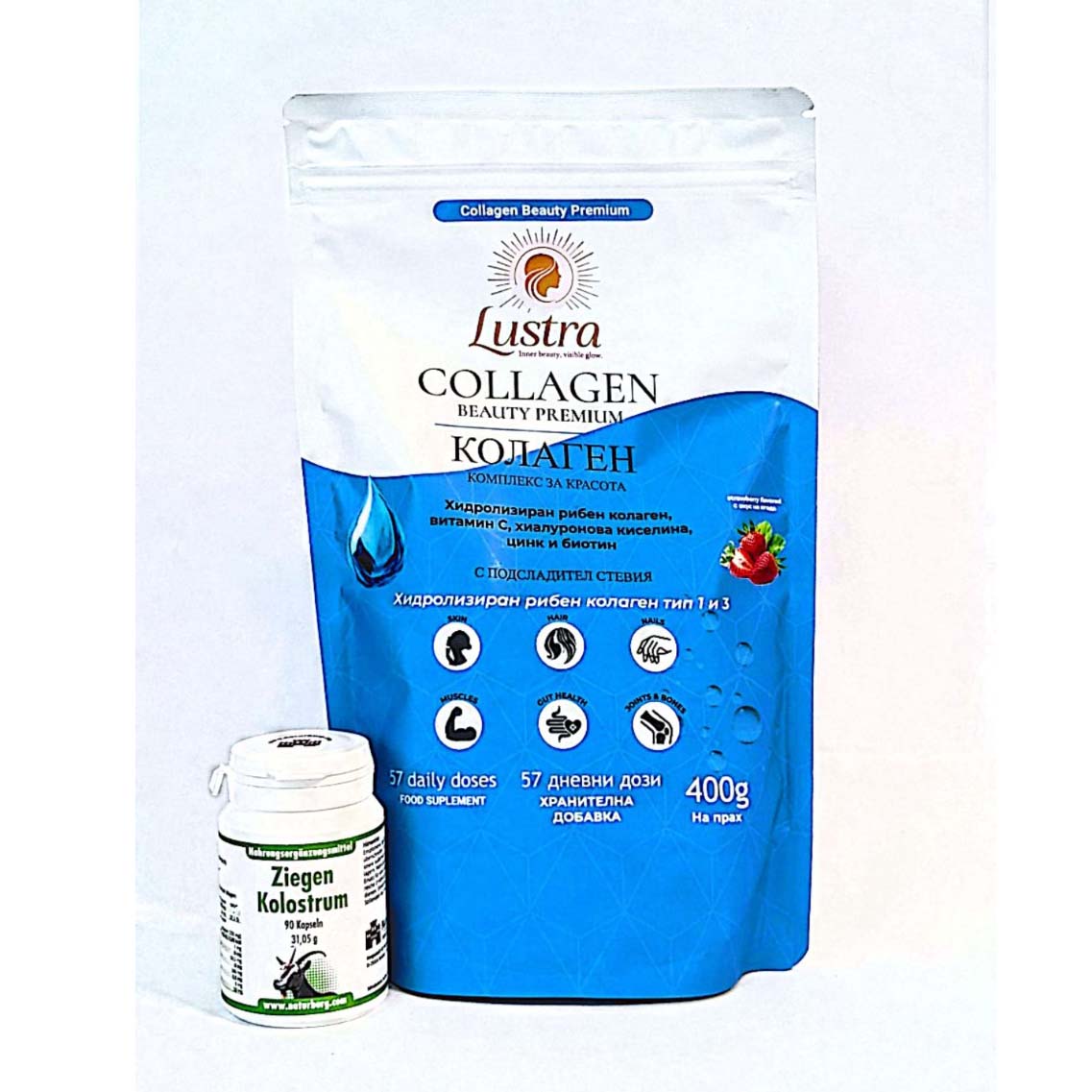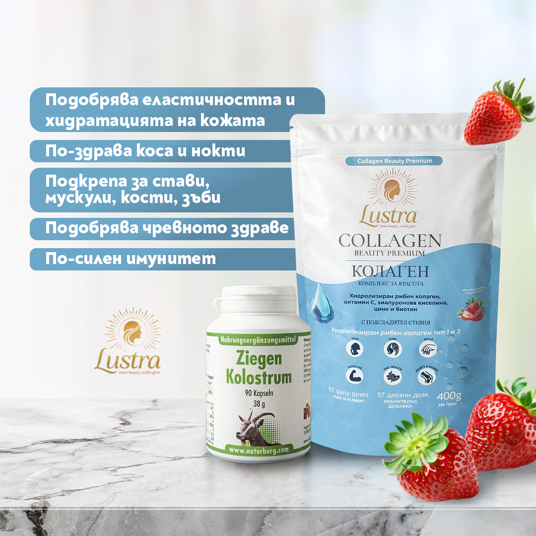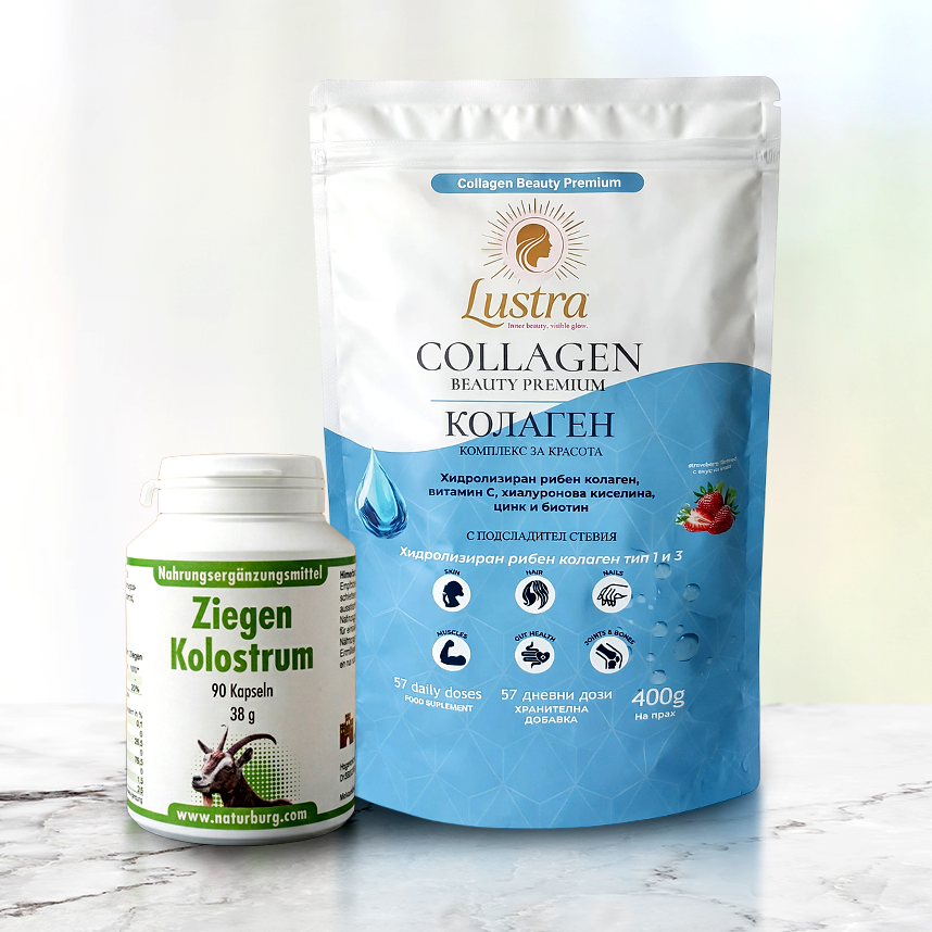 Пакет „Коластра и Колаген“ съдържа два продукта, които перфектно се съчетават за подпомагането на здравето и добрия имунитет, подпомага физическата издръжливост на стави,мускули и кости. И двата продукта действат за подобряването на еластичността на кожата, добрият външен вид на коса и нокти. Описания на продуктите: